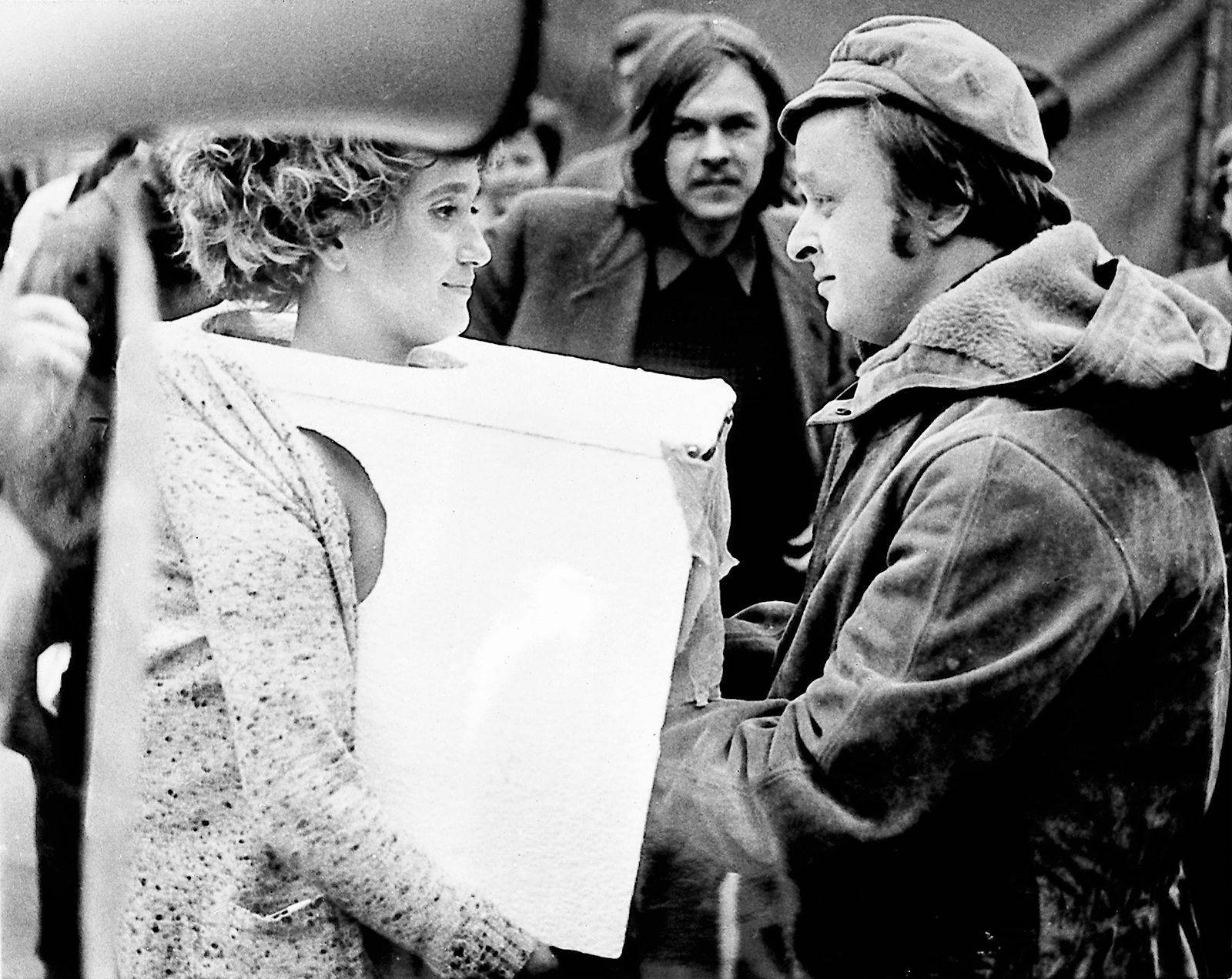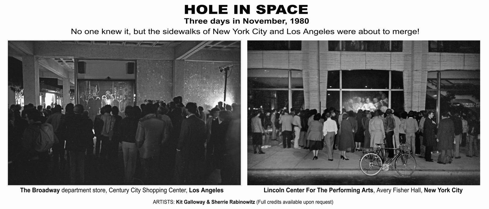 Kit Galloway and Sherrie Rabinowitz, Hole in Space, 1980. On screens in front of Lincoln Center and The Broadway department store in Los Angeles, passersby could see and talk to their counterparts on the opposite coast, and many “reunions” were quickly set up, in this early example of video conferencing. Courtesy of the Sherrie Rabinowitz and Kit Galloway Archives.