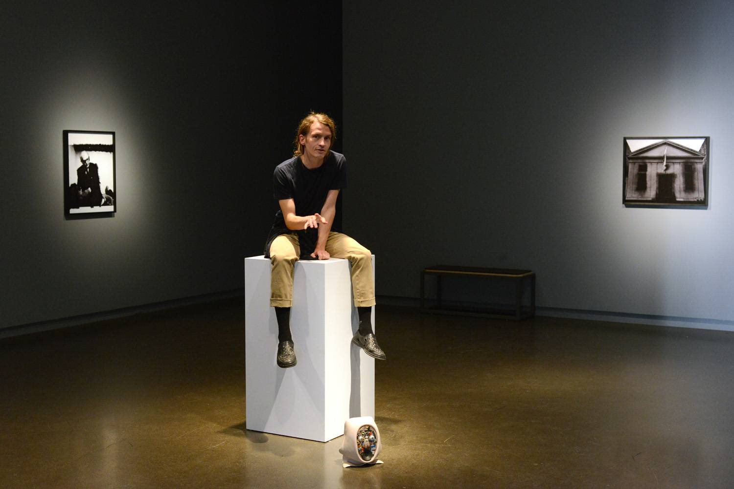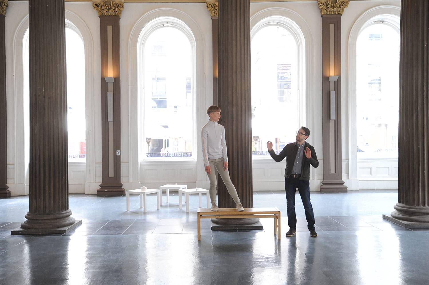 David Levine, Bystanders, 2015. Installation view, Gallery TPW, Toronto. Performer: William Ellis. Photo: Guntar Kravis.