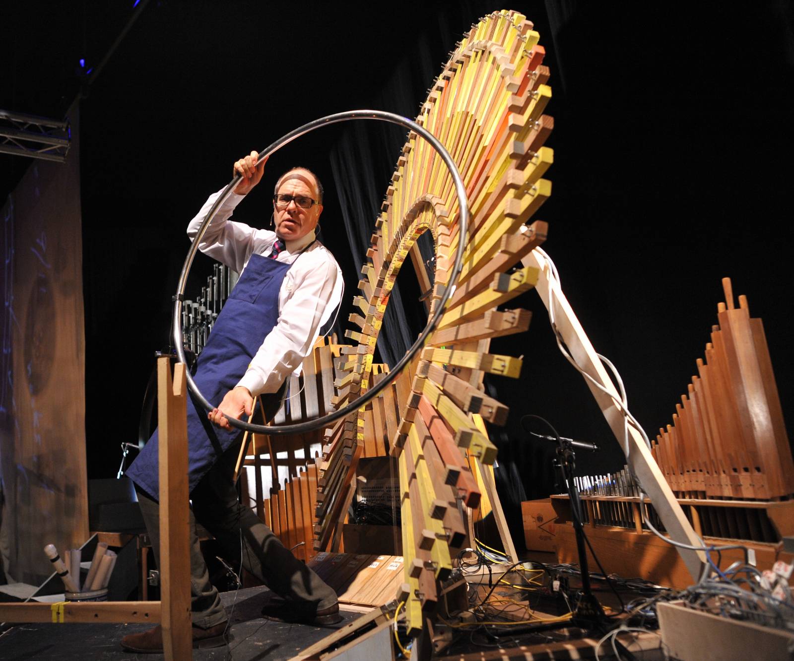 Steven Schick at the “Peacock” in the Paul Dresher Ensemble Production of Schick Machine, 2009, by Paul Dresher, Steven Schick, and Rinde Eckert. Mondavi Center, UC Davis, Davis, CA. Photo: Cheung Chi Wai.