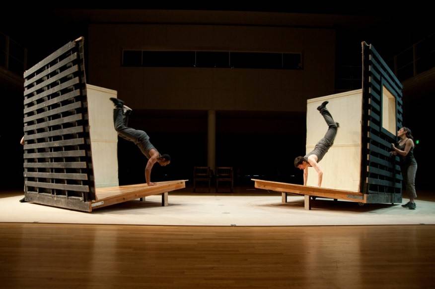 Joanna Haigood and Charles Trapolin, The Monkey and the Devil, performance installation, 2011. Performers: Matthew Wickett, Sean Grimm, Jodi Lomask. Photo: Walter Kitundu.