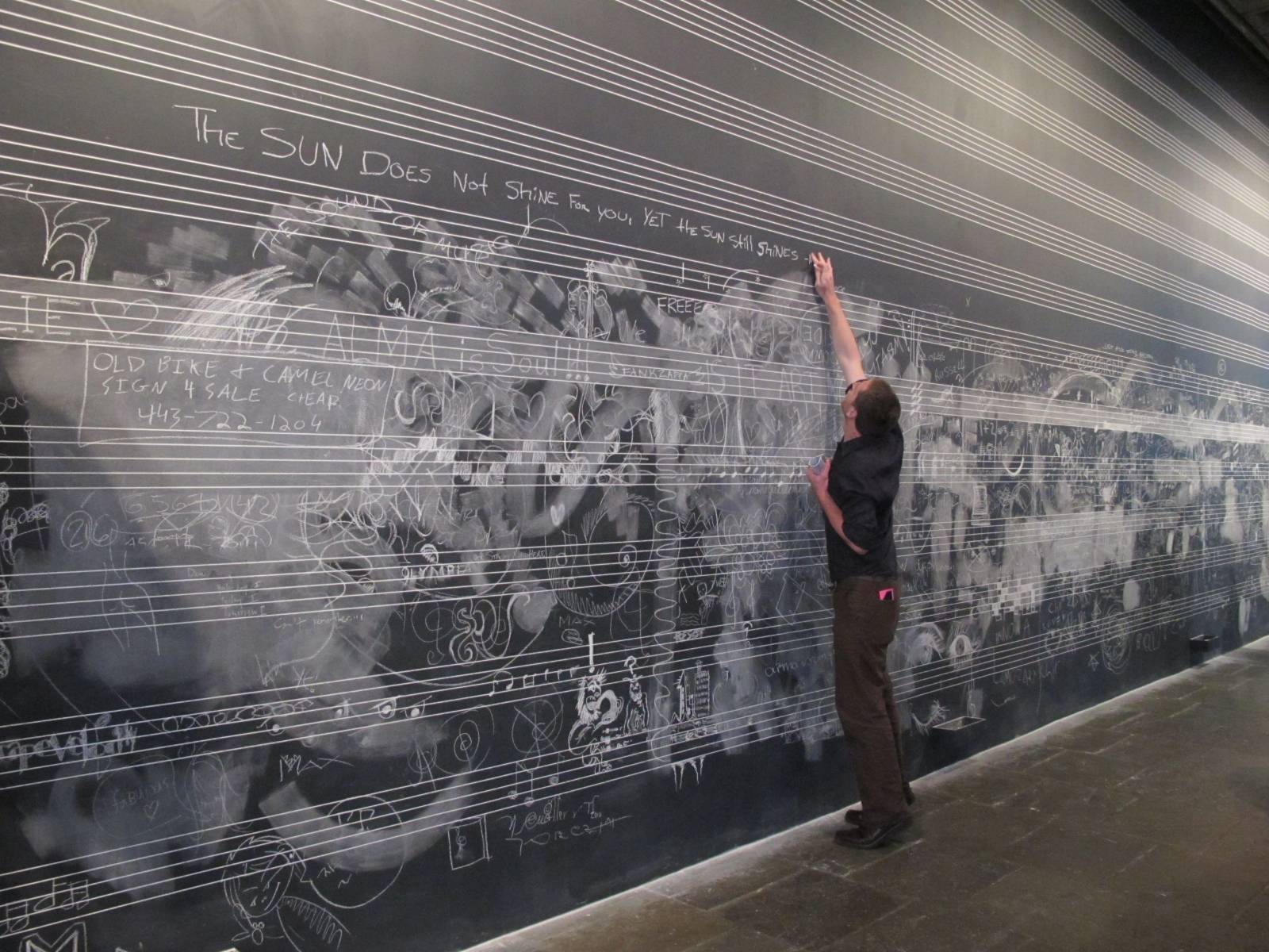 Christian Marclay, Chalkboard, 2010, paint and chalk, 210 x 1,045 inches. Installation view, “Christian Marclay: Festival,” 2010, Whitney Museum of American Art, New York. Collection of the artist; courtesy of Paula Cooper Gallery, New York. Photo: Christian Marclay.
