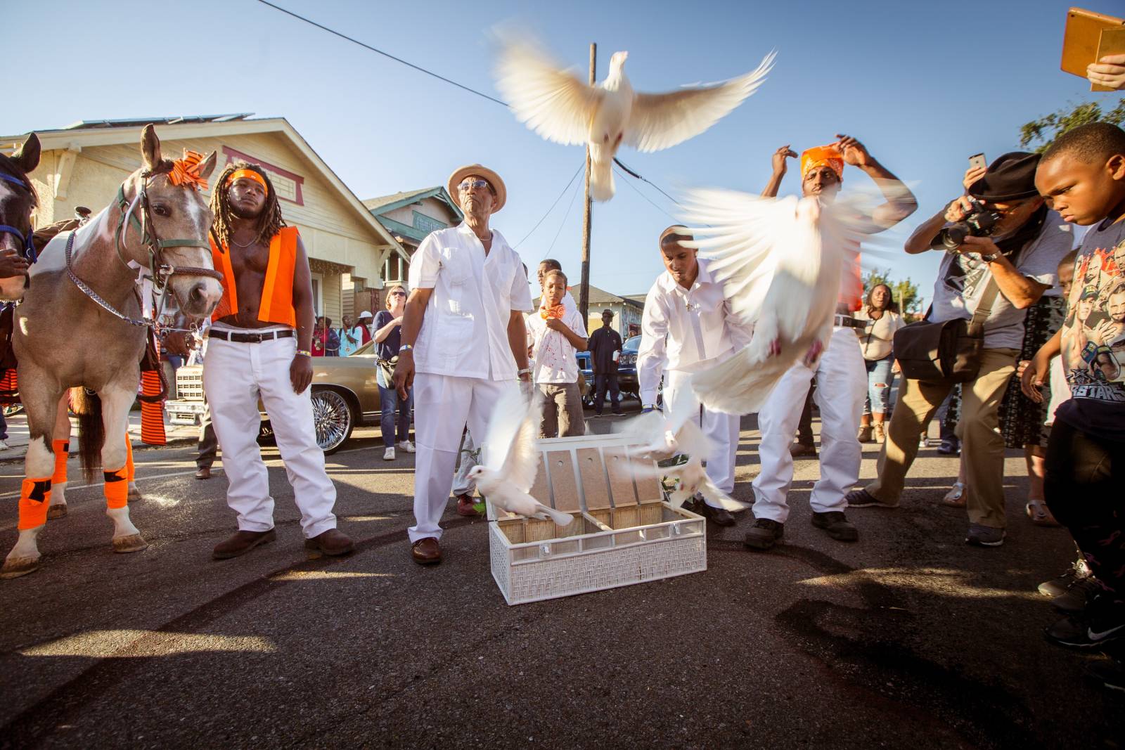 Chief Dalcour and the Serenity Peace Birds in “Public Practice: An Anti-Violence Community Ceremony,” curated by Delaney Martin and Claire Tancons for New Orleans Airlift, October 25, 2014. Photo: Josh Brasted.
