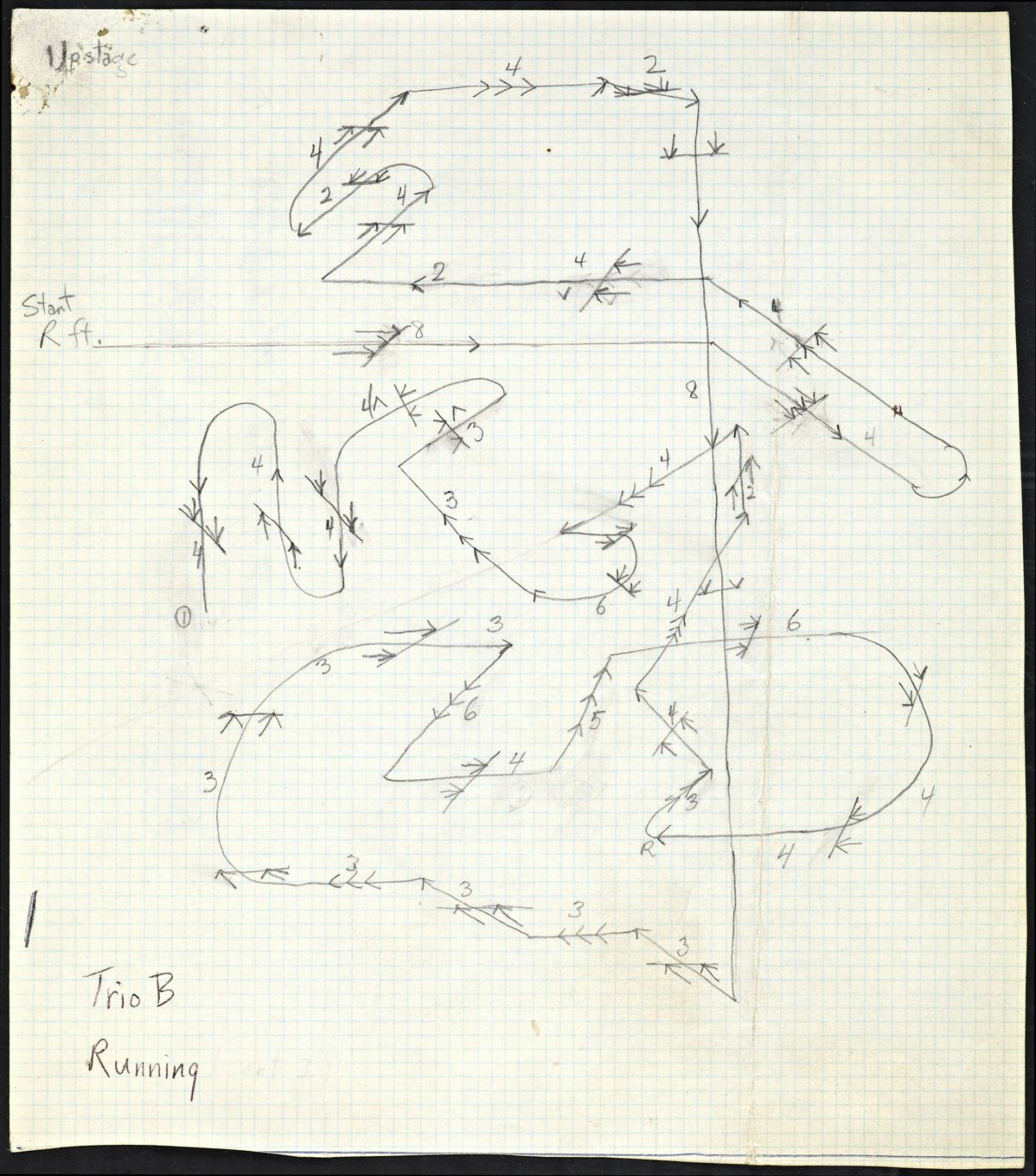 Yvonne Rainer, score for “Trio B: Running,” from The Mind Is a Muscle, 1966–68. Graphite and ink on paper, 8 5/16 x 7 5/16". The Getty Research Institute. © Yvonne Rainer.