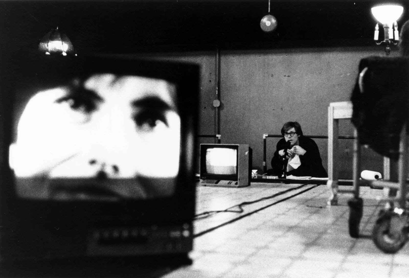 The Wooster Group, BRACE UP!, 1991. Directed by Elizabeth LeCompte. Anna Köhler (on monitor) and Willem Dafoe. Photo © Mary Gearhart.