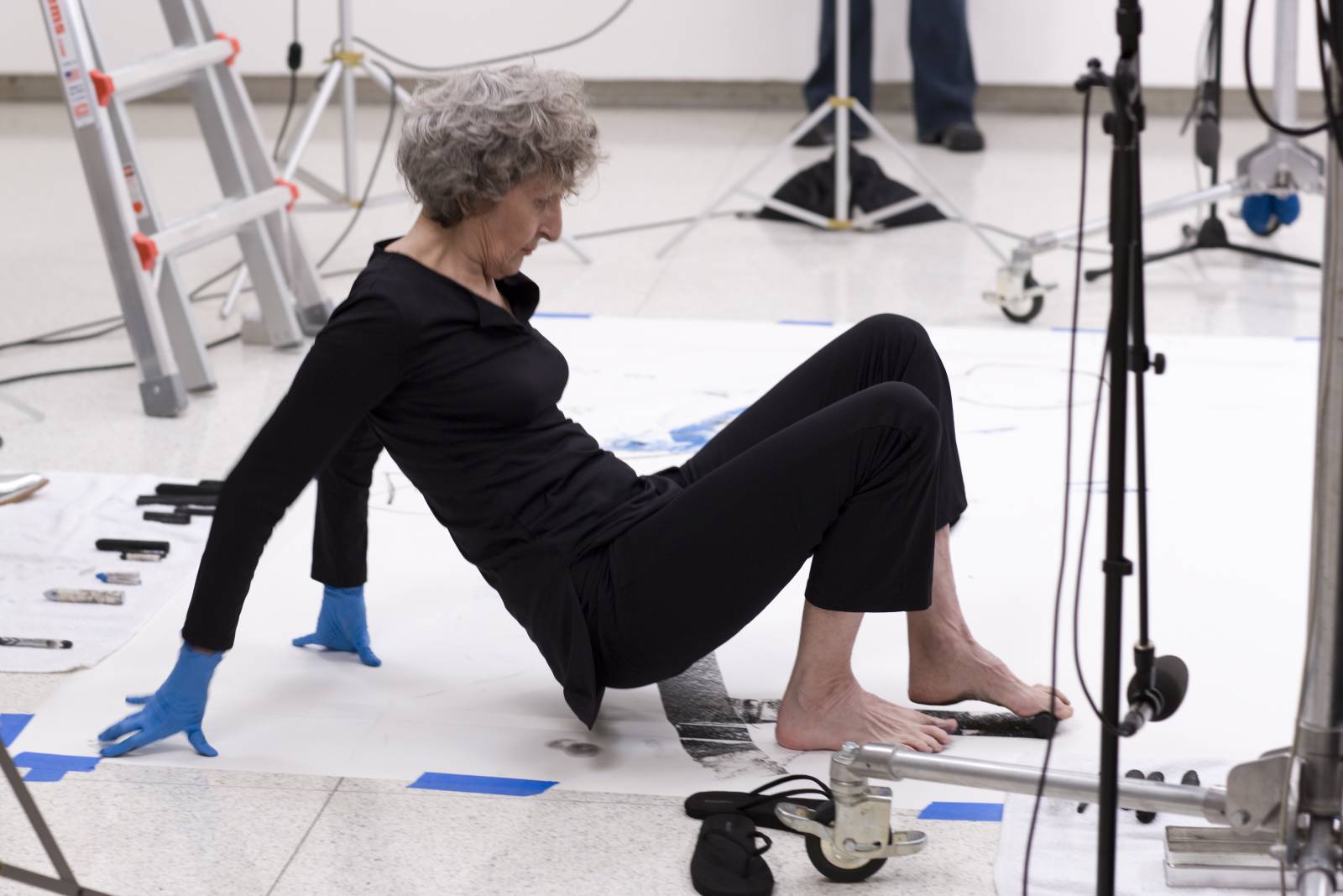 Opening performance of the exhibition “Trisha Brown: So That the Audience Does Not Know Whether I Have Stopped Dancing,” Walker Art Center, Minneapolis, 2008. Brown improvises movements across a large piece of paper on the Medtronic Gallery floor, holding charcoal and pastel between her fingers and toes, drawing extemporarily. Photo: Gene Pittman for Walker Art Center, Minneapolis.