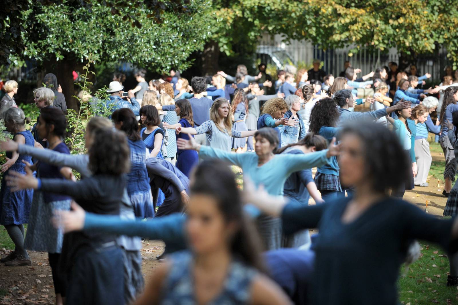 Rosemary Lee, Square Dances, 2011, commissioned by Dance Umbrella. Square Dances took place in four central London squares throughout a day, with different casts in each: 10 children in Woburn Square, 100 women in Gordon Square, 35 men in Brunswick Gardens, 25 dance students in Queen Square. Each performance involved bells, ranging from a huge church bell that struck every minute; to a handmade musical instrument using bells within its barrel structure, created and composed by Terry Mann; to tiny hand bells for the dancers. Photo: Hugo Glendinning.