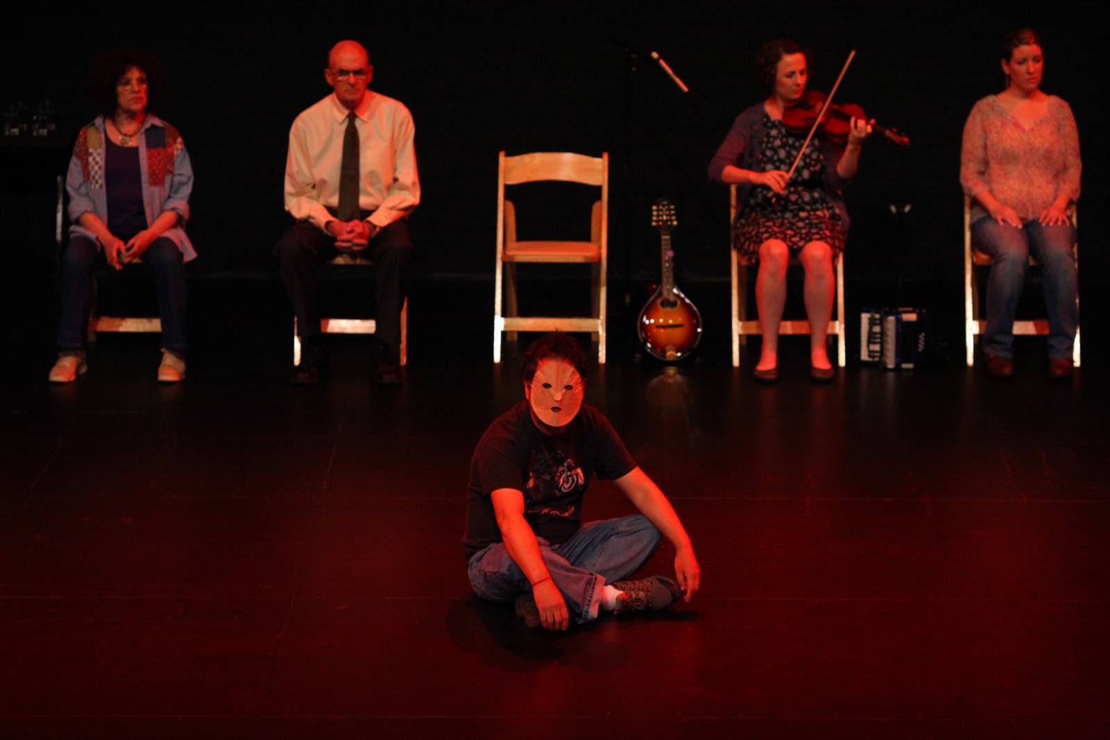 Richard Maxwell, Neutral Hero, 2012. The Kitchen, New York. From left: Janet Coleman, Bob Feldman, Lakpa Bhutia, Andie Springer, Jean Ann Garrish. Photo © Paula Court.